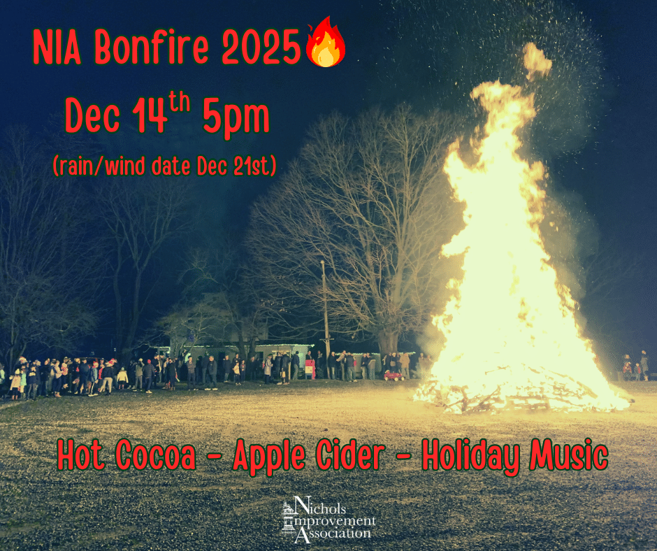 Join the NIA Dec 14th for our traditional bonfire! We will serve hot cocoa, apple cider and enjoy some festive music. Join your neighbors for this 100+ year tradition in Nichols!